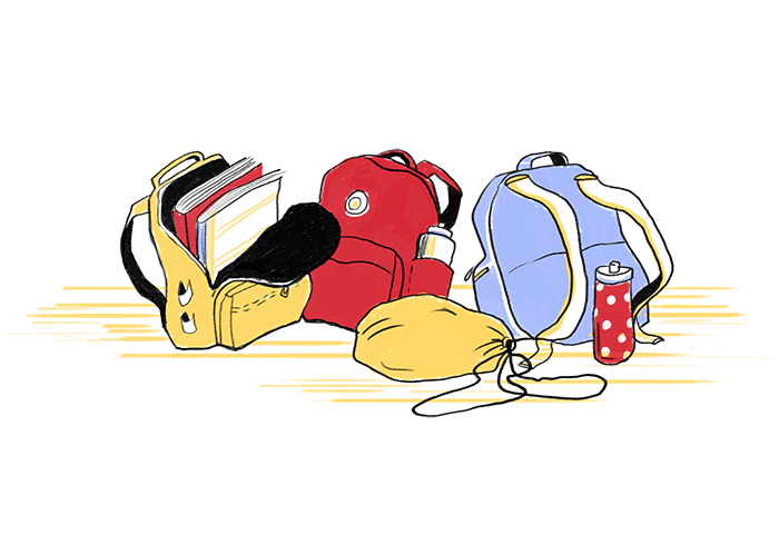 Teikning af litríkum skólatöskum.